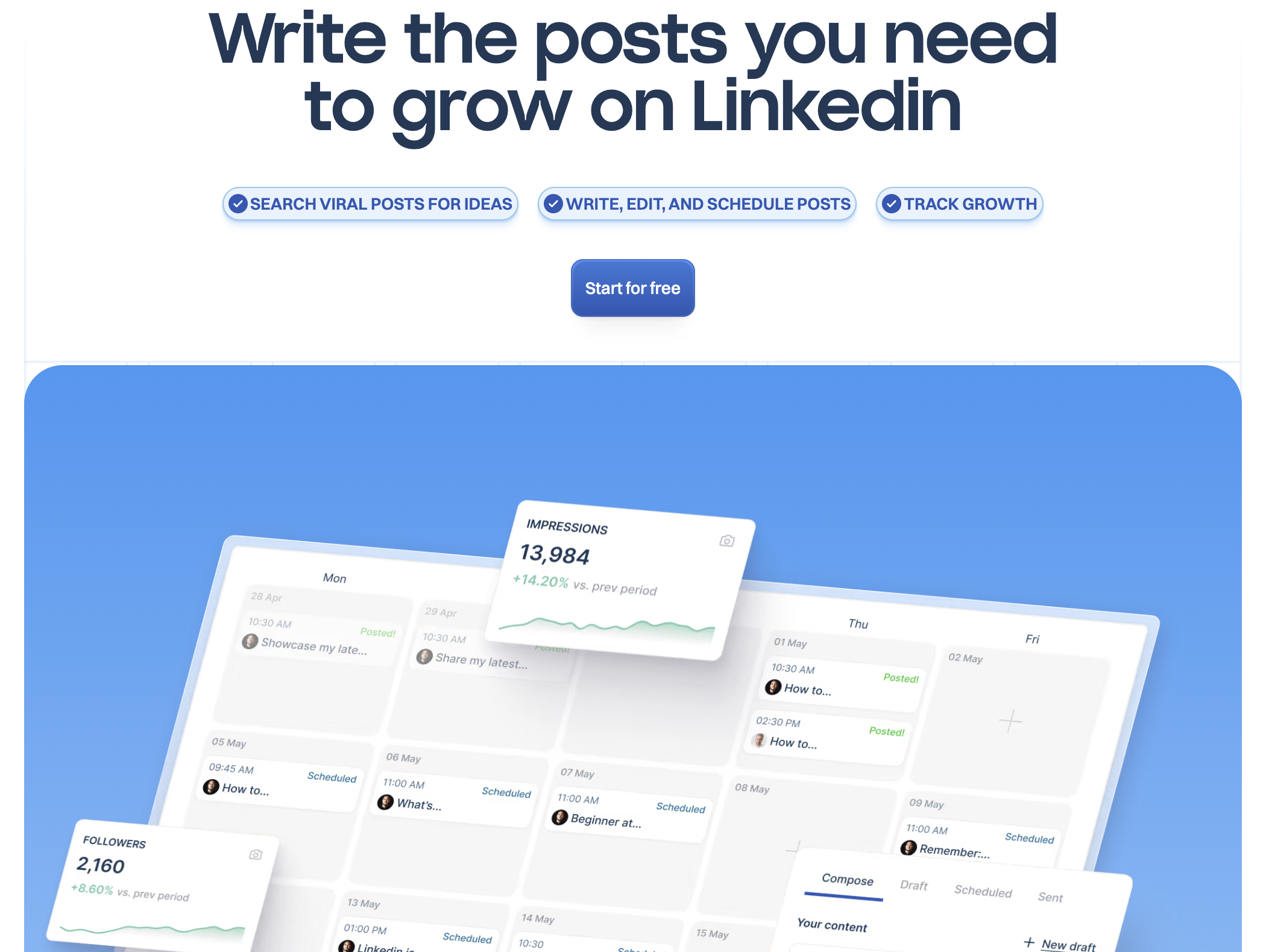 Best for: Founders, thought leaders, and creator-marketers who publish 3-5x per week on LinkedIn and want AI-assisted content creation with performance analytics.