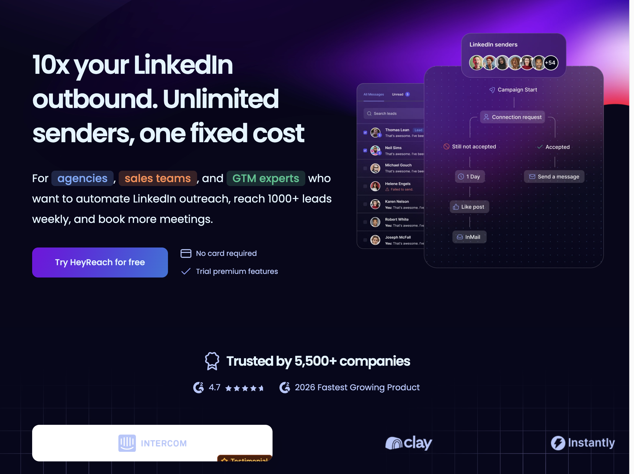 HeyReach solves a problem that most LinkedIn automation tools ignore: managing outreach across 5, 10, or 20 LinkedIn accounts from a single dashboard. For agencies running LinkedIn campaigns on behalf of clients, or large sales teams with distributed reps, HeyReach's unified dashboard and sender rotation are the core value propositions.