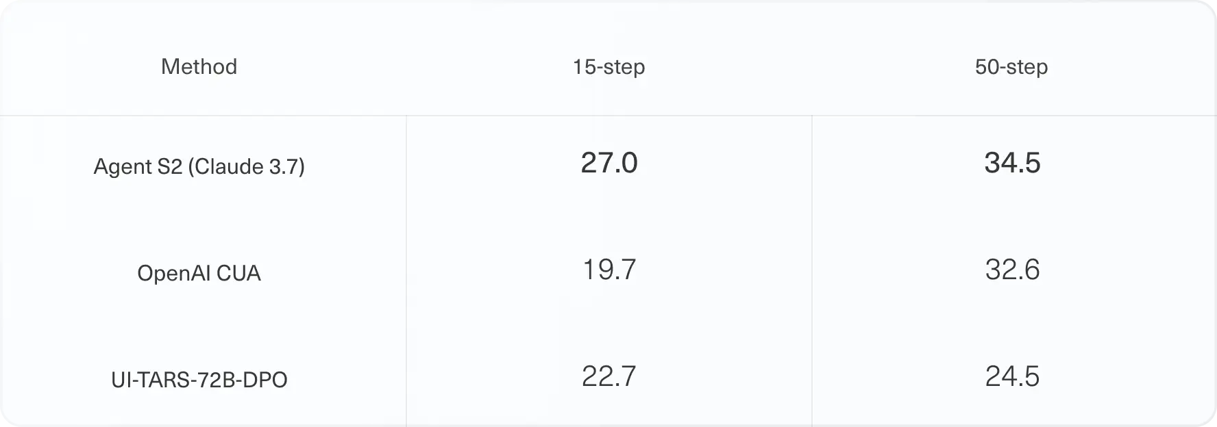 Agent S2 sets a new bar on the widely-used OSWorld benchmark: