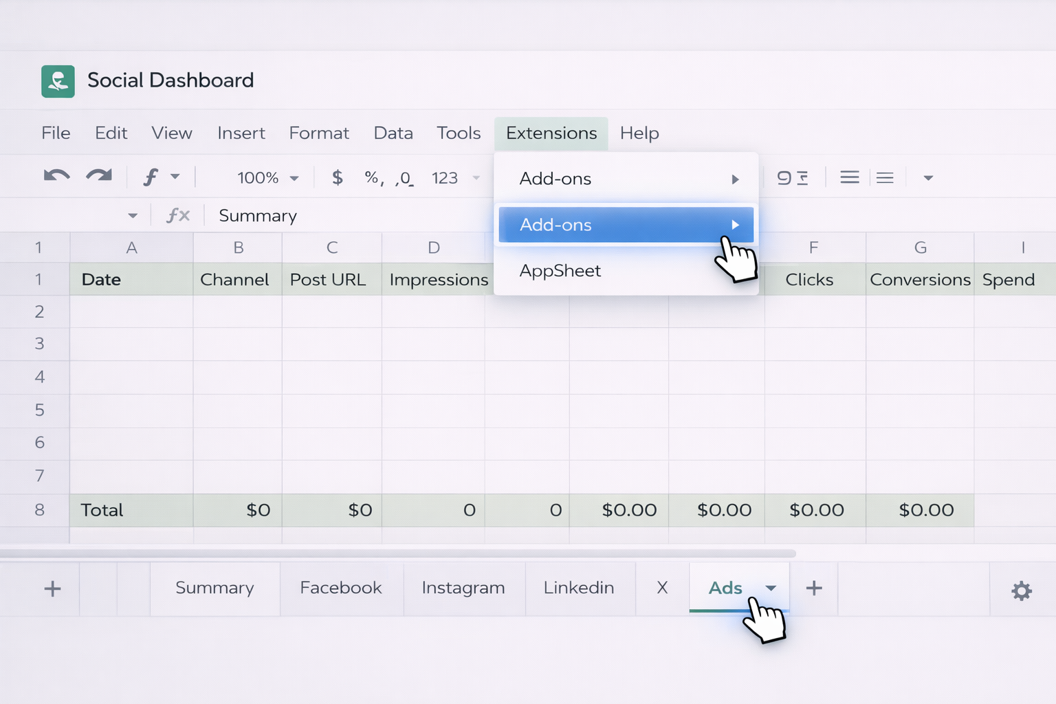 Templates in Google Sheets and Excel give you a repeatable frame: predefined tabs for channels, unified KPI definitions, and charts that auto update when new data lands. They make social performance visible for founders, sales teams, and clients without anyone touching the raw platforms.