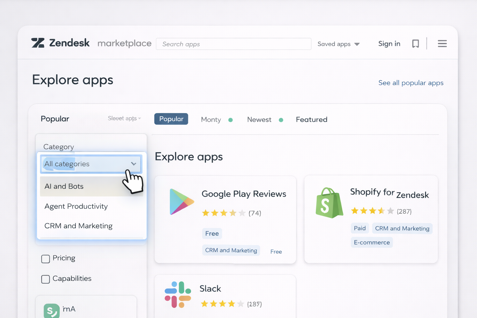 Start with the problem, not the app. List the top 3 bottlenecks in your support or revenue workflows (for example: slow first response time, no visibility into orders, poor survey follow‑up). Then go to https://www.zendesk.com/marketplace/apps/ and filter by the category that matches each issue (AI and Bots, Agent Productivity, CRM and Marketing, etc.). Sort by Featured or Popular to see what is widely adopted. Open 3–5 candidates per problem, read ratings and recent reviews, and note pricing models.
