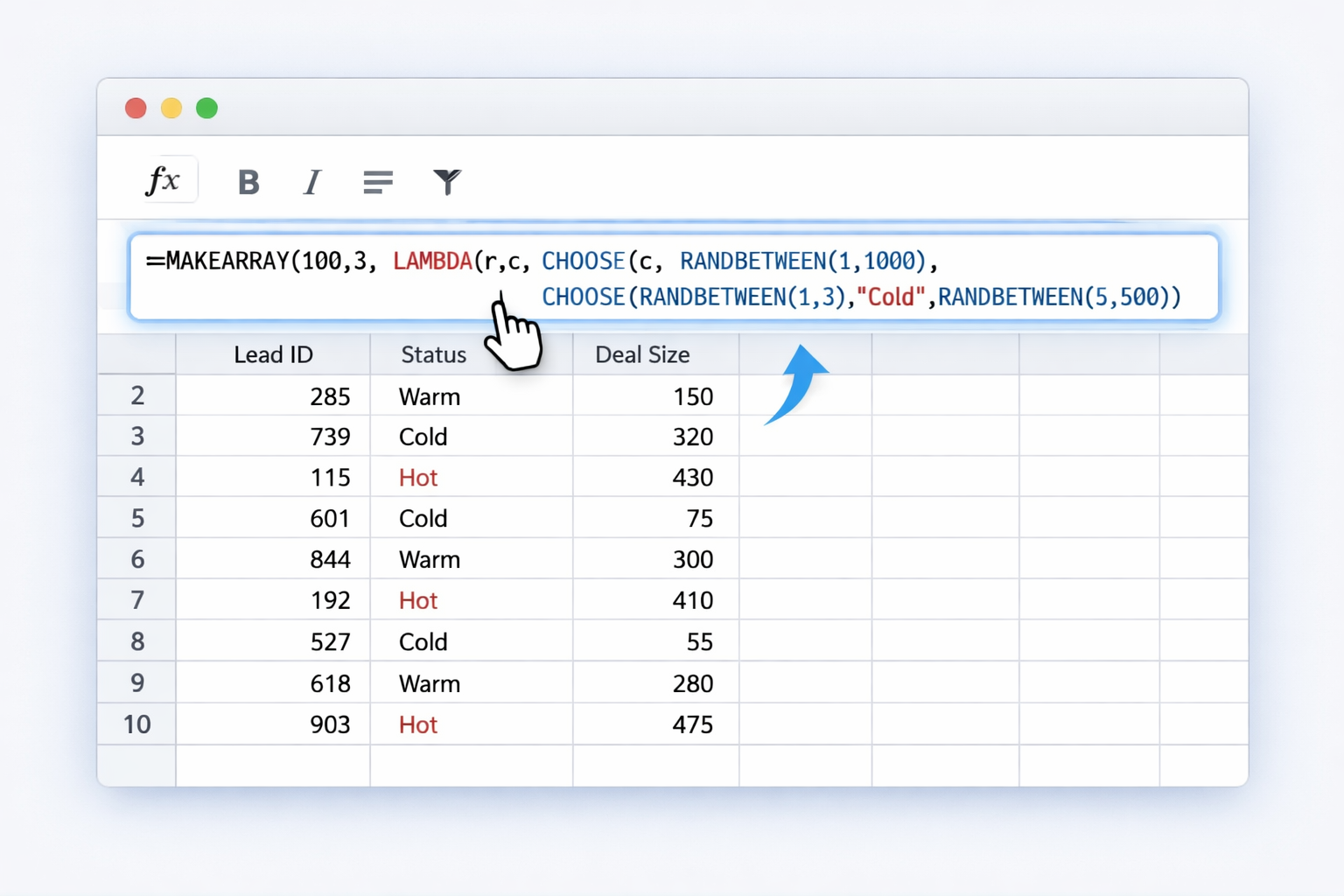 Use MAKEARRAY with RANDBETWEEN and CHOOSE to simulate leads or orders: