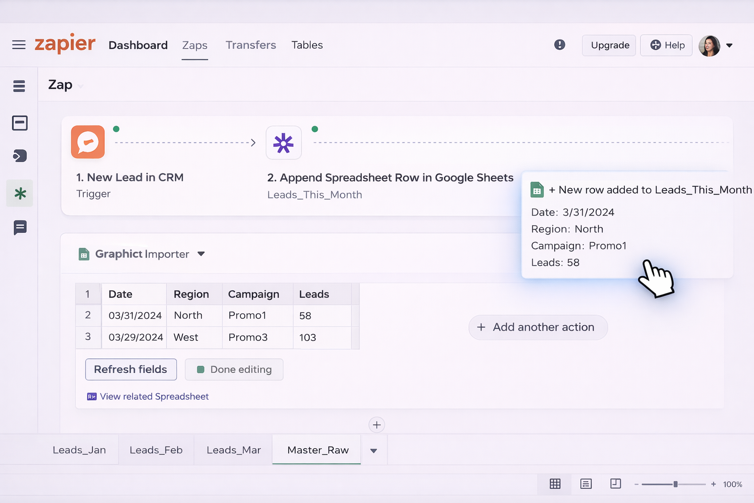 Master_Raw.Leads_Jan, Leads_Feb), select the entire data range, including headers.Master_Raw!A1.Master_Raw.Campaign or Region).Amount as SUM, Leads as COUNTA).
