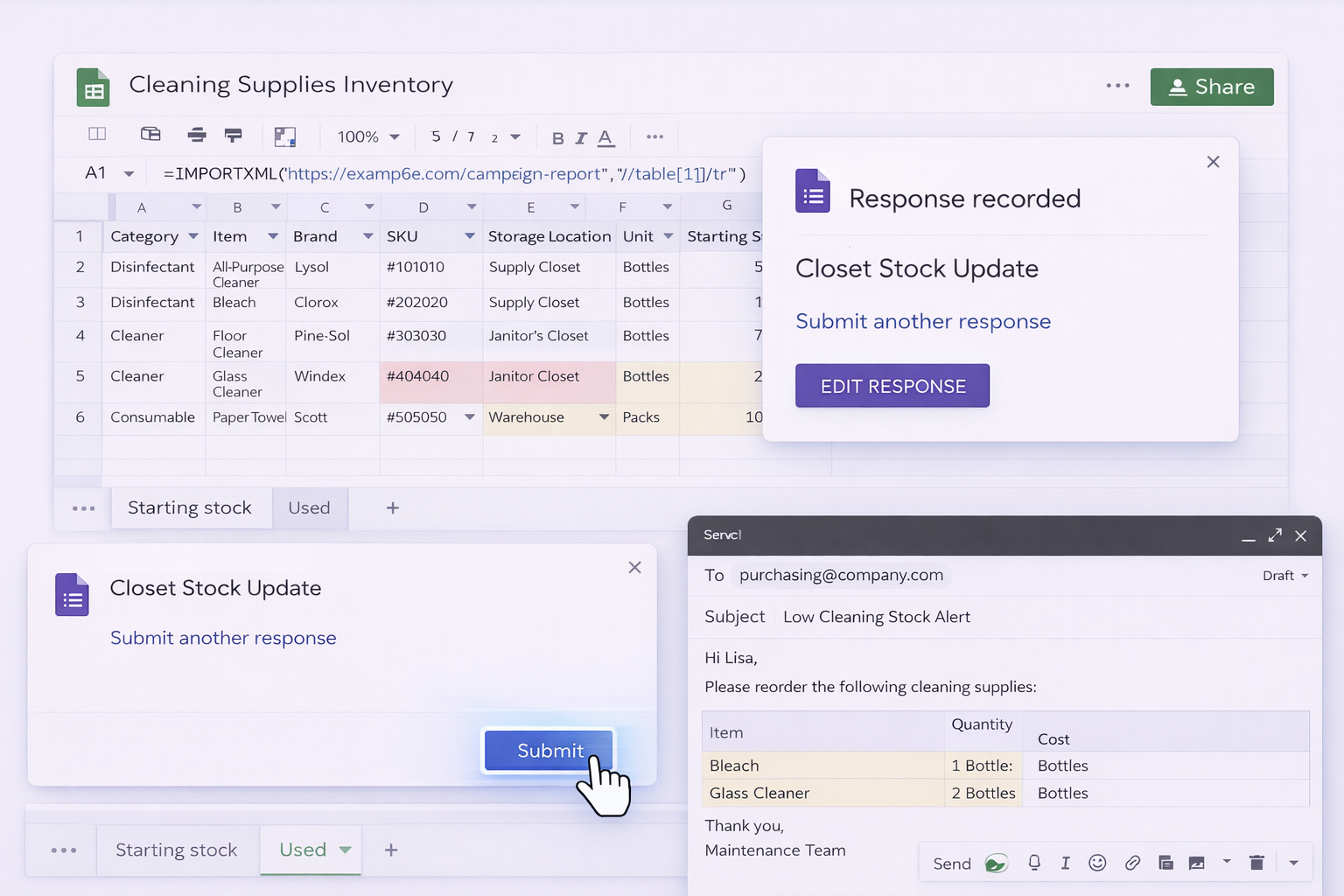 Frequency depends on your volume and risk. For a small residential cleaning agency, weekly updates might be fine. For commercial or healthcare cleaning, daily or per-shift visibility can prevent costly stockouts.\n\nIf you rely on manual updates, set a recurring calendar event for supervisors: a 15-minute "inventory sprint" at the start or end of a shift. They walk the supply room with a phone or tablet, open the Google Sheets or Excel template, and adjust quantities live. Use data validation in Sheets or Excel to enforce dropdowns for Category and Location so they can move fast without typos.\n\nOnce you have an AI agent like Simular in the loop, you can increase the "update frequency" without increasing human effort. The agent can refresh data every night: reconciling purchase orders, delivery confirmations, and consumption logs into your template so by morning, managers see an accurate picture across all sites.