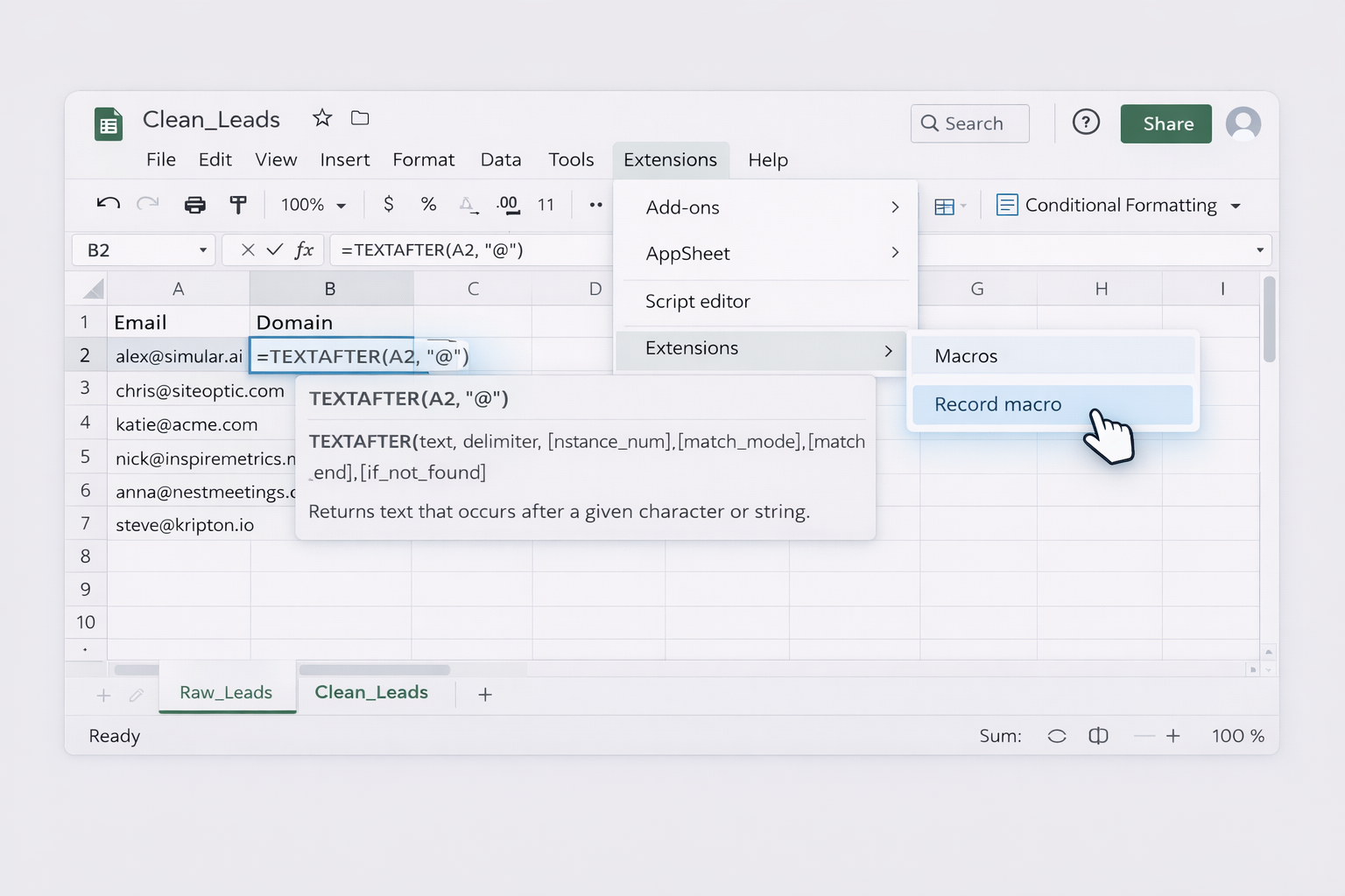 Raw_Leads.Clean_Leads, set up formulas:=Raw_Leads!A2.=INDEX(SPLIT(Raw_Leads!A2, "@"), 1, 2).Raw_Leads.Result: Drop in a new file, click a macro (or wait for the trigger), and all the “TEXTAFTER-like” parsing runs for you.