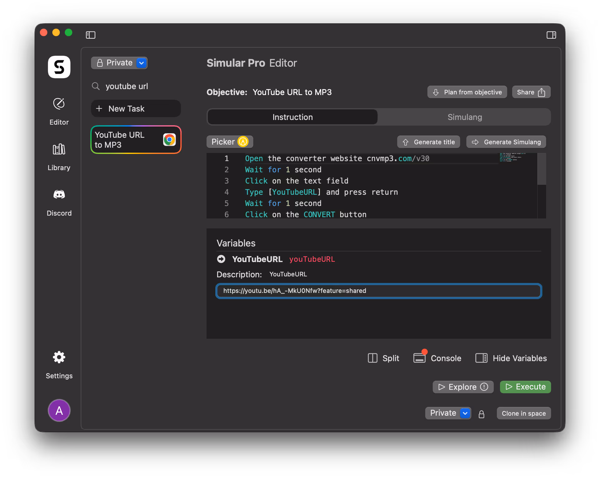 This Simular workflow automates the full pipeline of converting YouTube videos to MP3 audio files using a public conversion site. It handles everything — from URL input to file download, cloud upload, and link sharing — with transparent, repeatable browser-native scripting.