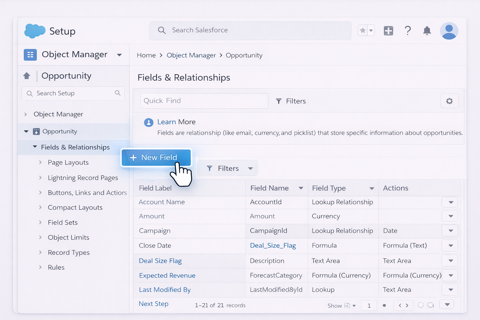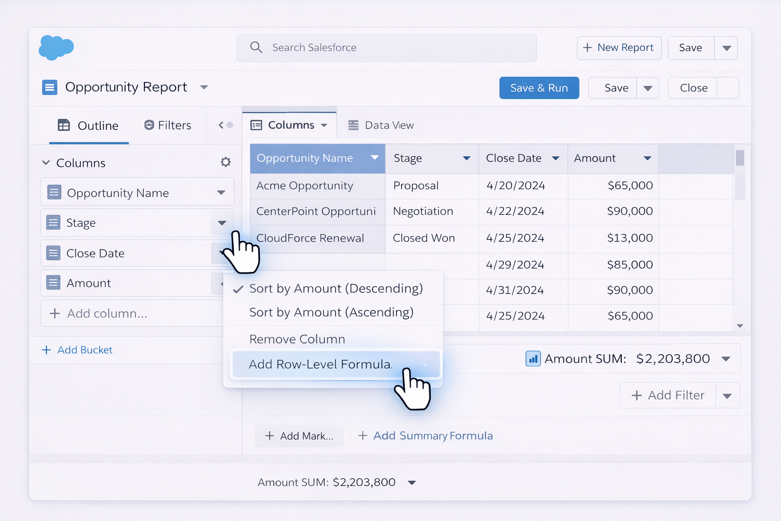 Row-level formulas calculate values per record inside a report. They’re ideal when you want insight for each opportunity, case, or account without creating new custom fields.