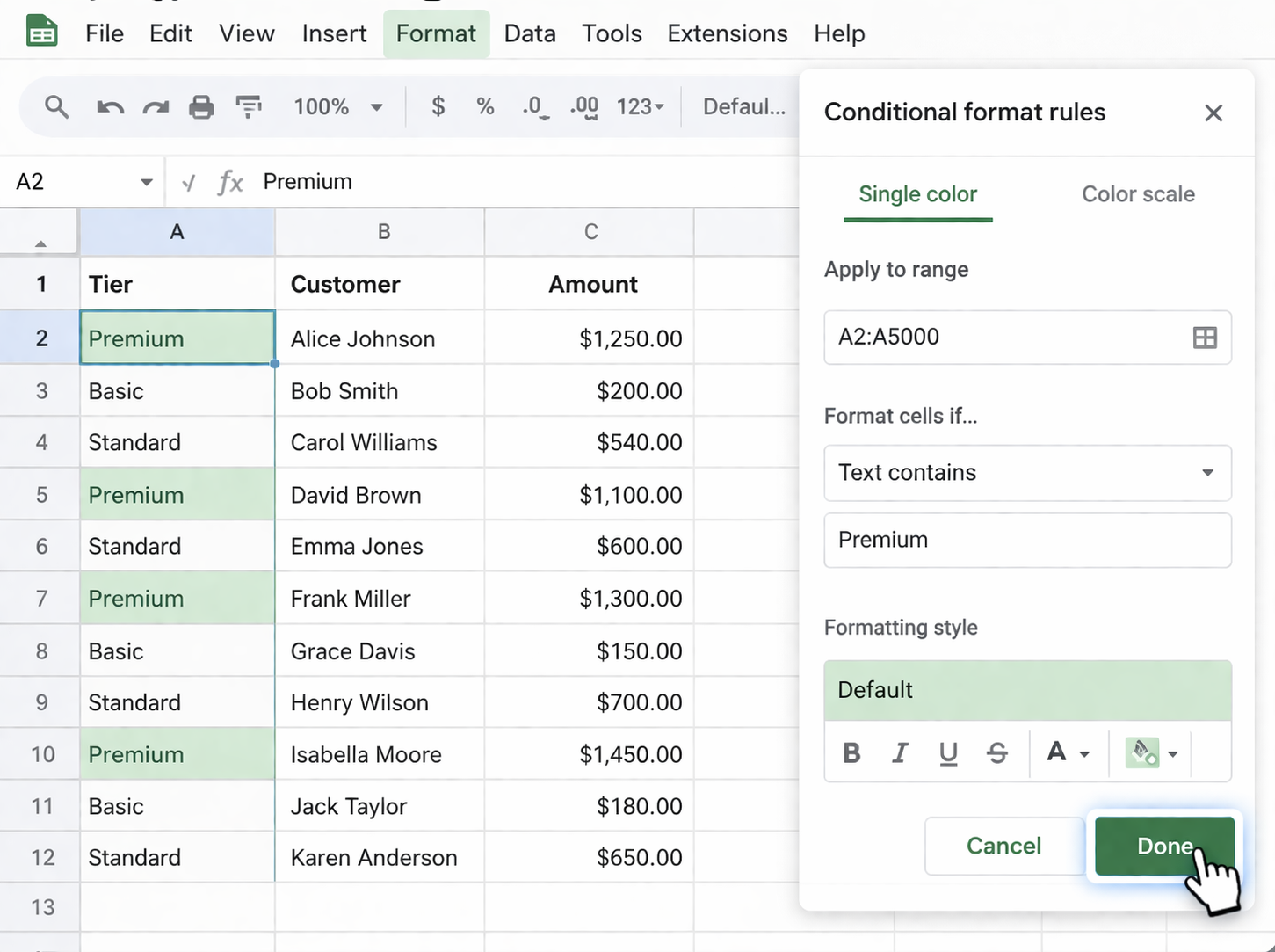 A2:A5000).=REGEXMATCH(A2, "VIP|High").Now, every time new data is added, matching cells light up automatically.