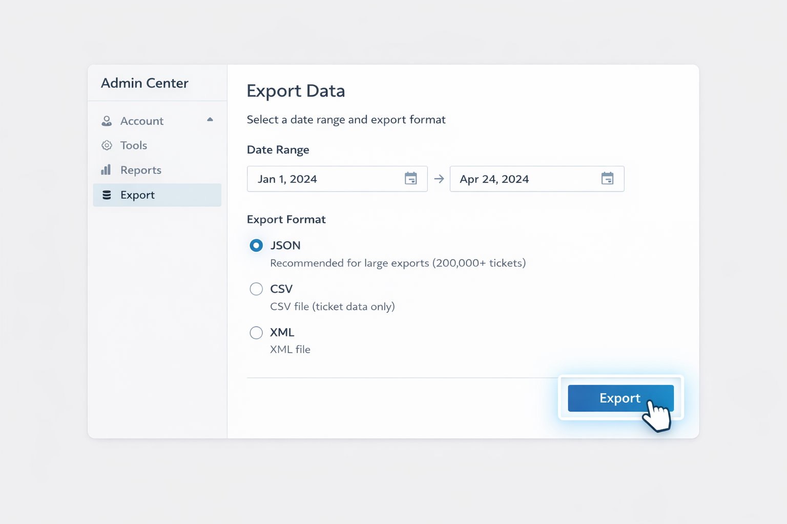 • JSON export (recommended for >200k tickets; supports tickets, users, organizations).